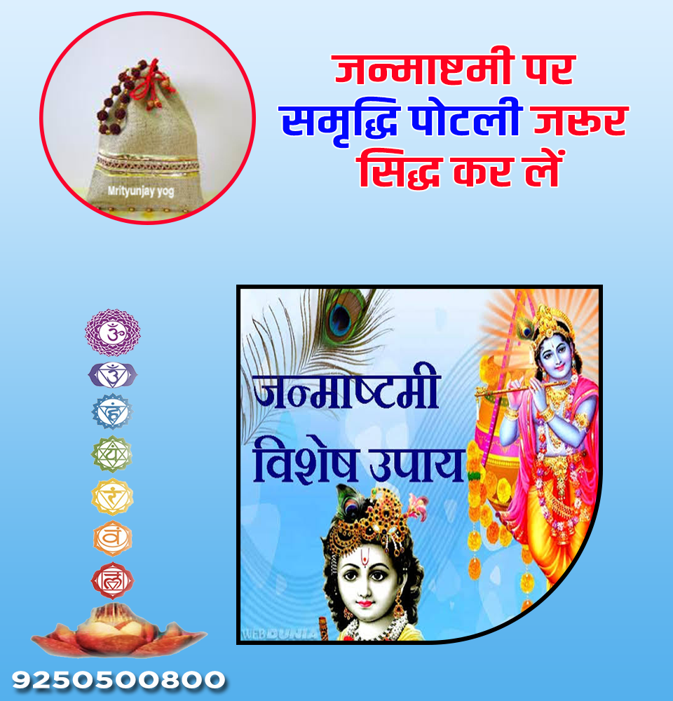 जन्माष्टमी में सिद्ध की गई सौभाग्य- समृद्धि पोटली कलह, विवादों, अदालती झंझटों, व्यवसायिक उलझनों की उर्जाओं को भी समाप्त करने में सक्षम होती है। जिससे आपस में प्रेम बढ़ता है। बंधन टूटते हैं। सम्मान बढ़ता है। राजसुख का आकर्षण होता है। जीवन उत्थान होता है।